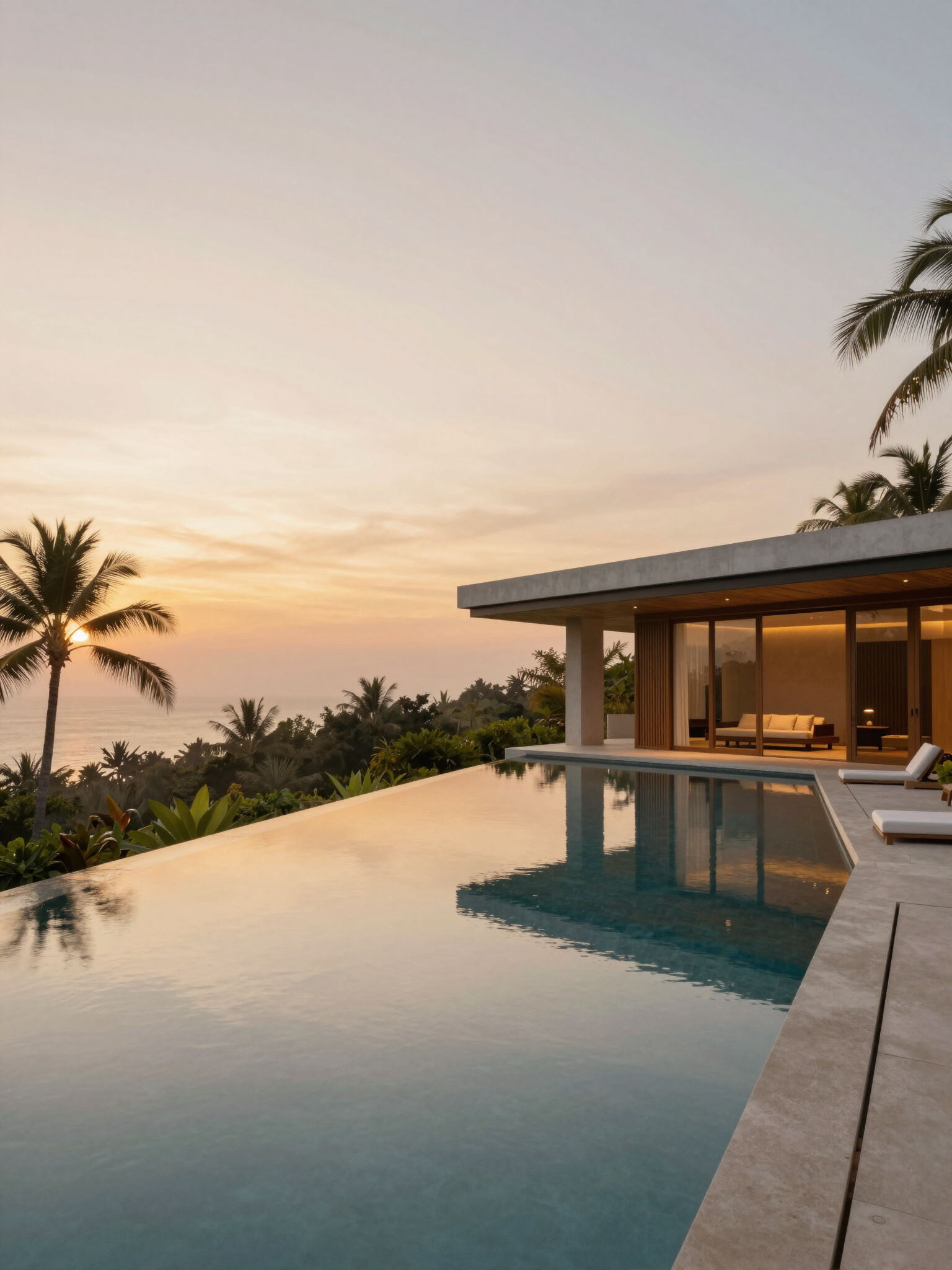 Expansive infinity pools featuring zero-edge stone detailing and integrated landscape seating.